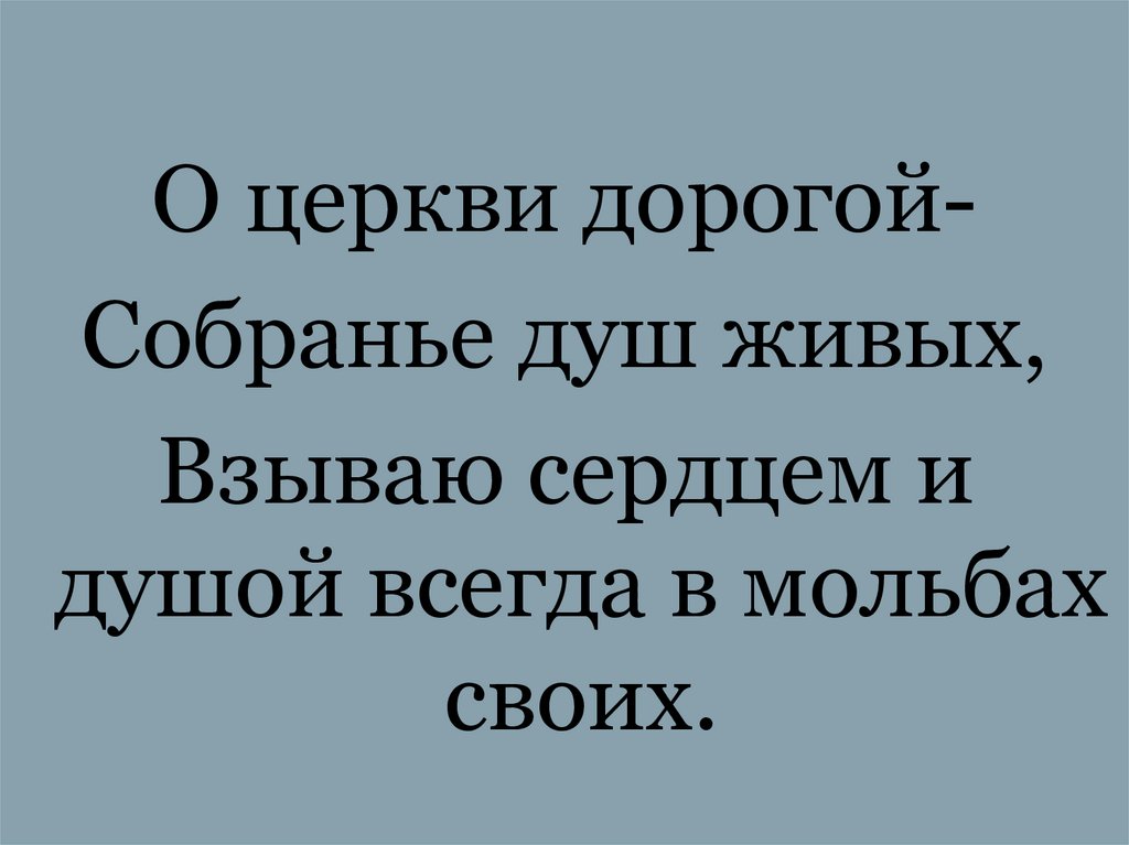 О церкви дорогойСобранье душ живых,Взываю сердцем и
