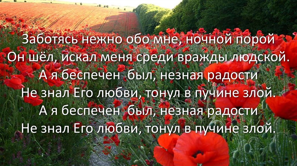Заботясь нежно обо мне, ночной поройОн шёл, искал меня среди вражды людской.