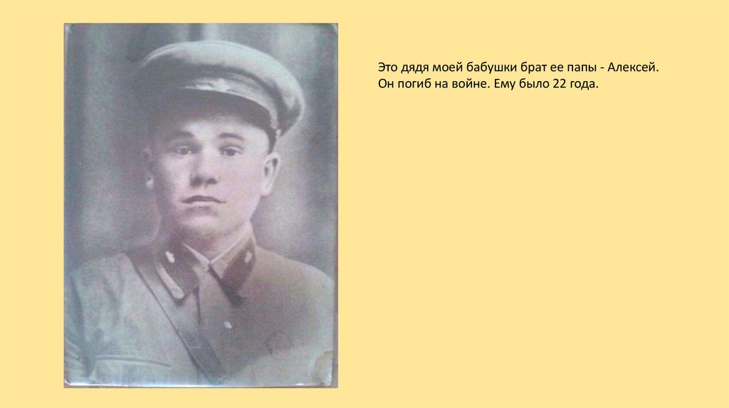 Это дядя моей бабушки брат ее папы - Алексей.Он погиб на войне. Ему было 22 года.