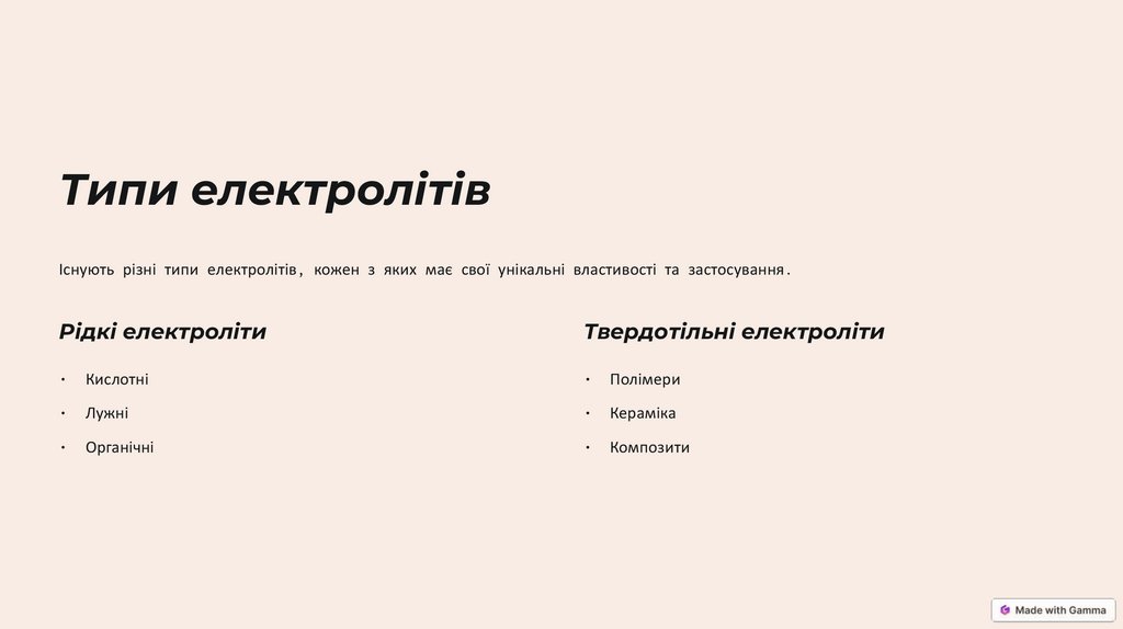 Типи електролітівІснують різні типи електролітів, кожен з яких має свої унікальні властивості та застосування.
