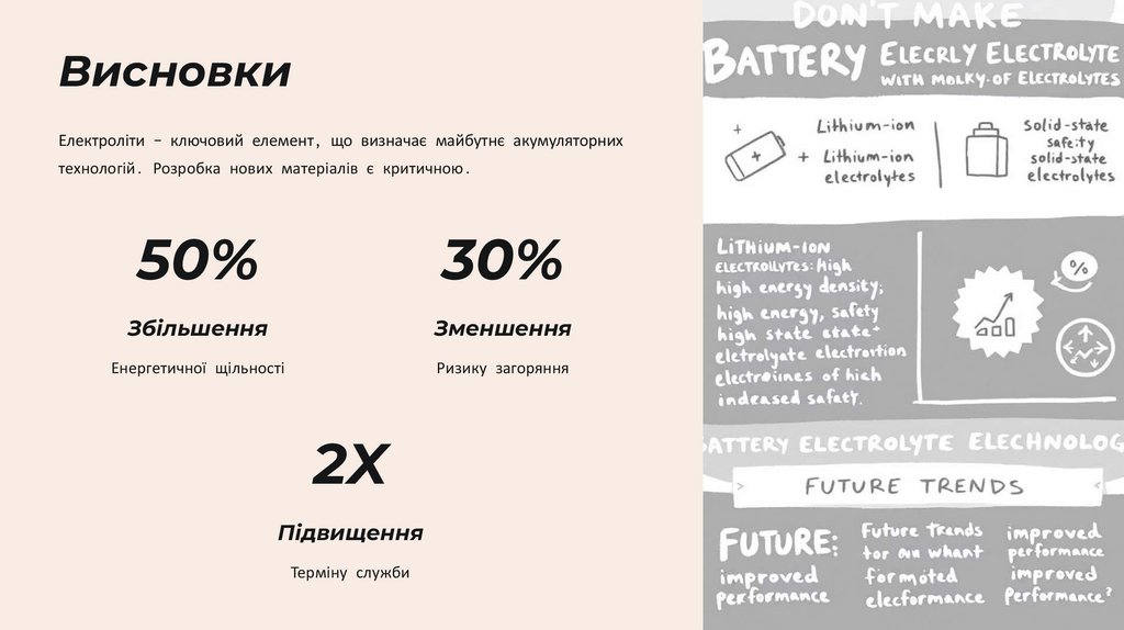 ВисновкиЕлектроліти – ключовий елемент, що визначає майбутнє акумуляторних