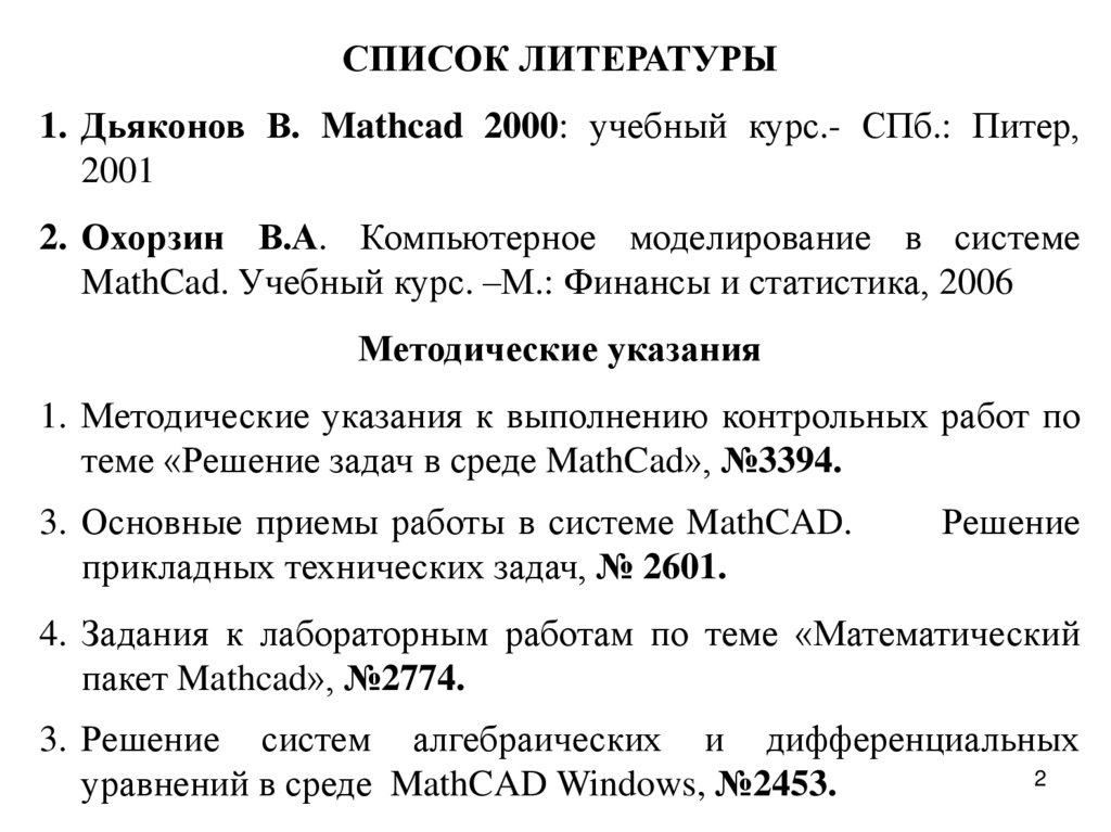 СПИСОК ЛИТЕРАТУРЫ1. Дьяконов В. Mathcad 2000: учебный курс.- СПб.: Питер,