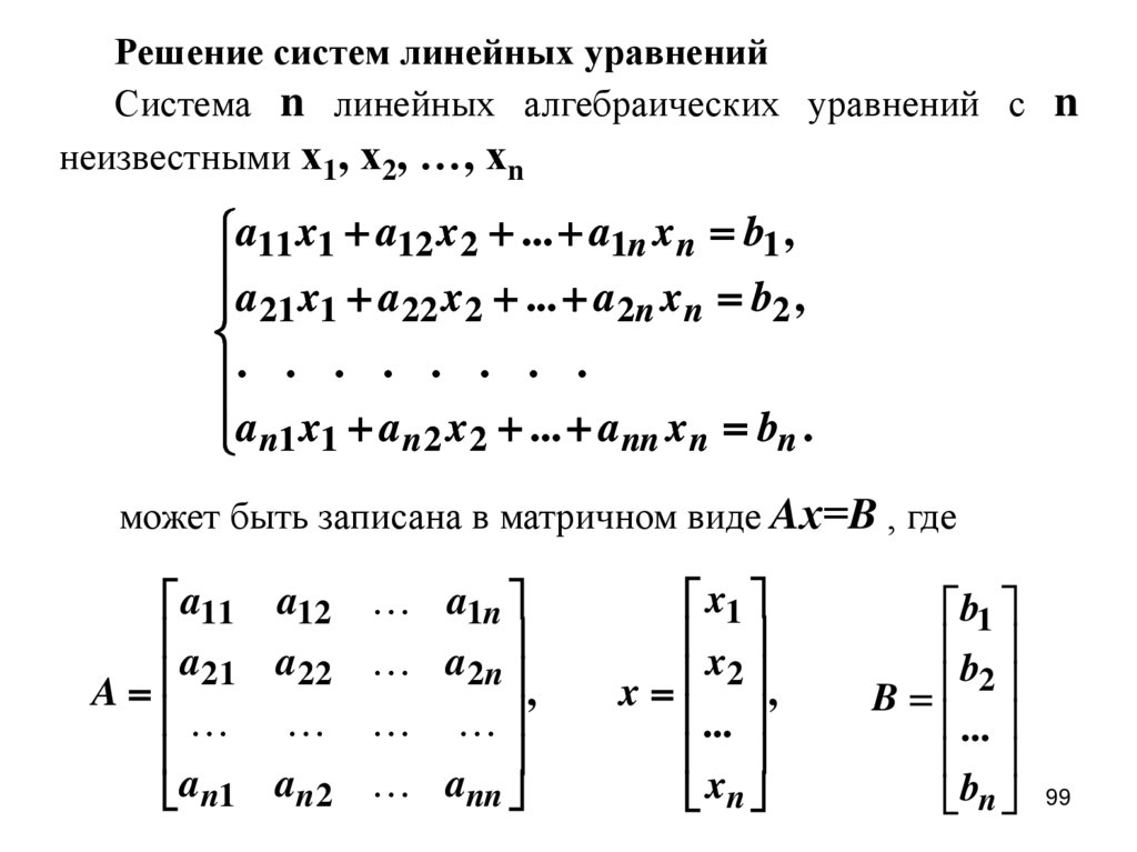 Решение систем линейных уравненийСистема n линейных алгебраических уравнений с n