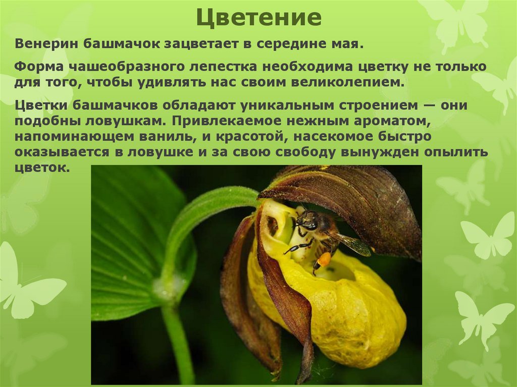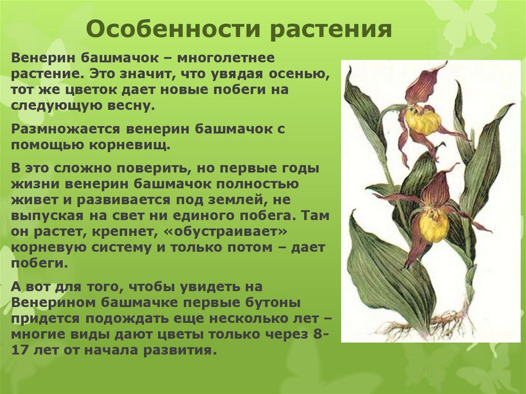 Венерин башмачок – многолетнеерастение. Это значит, что увядая осенью,