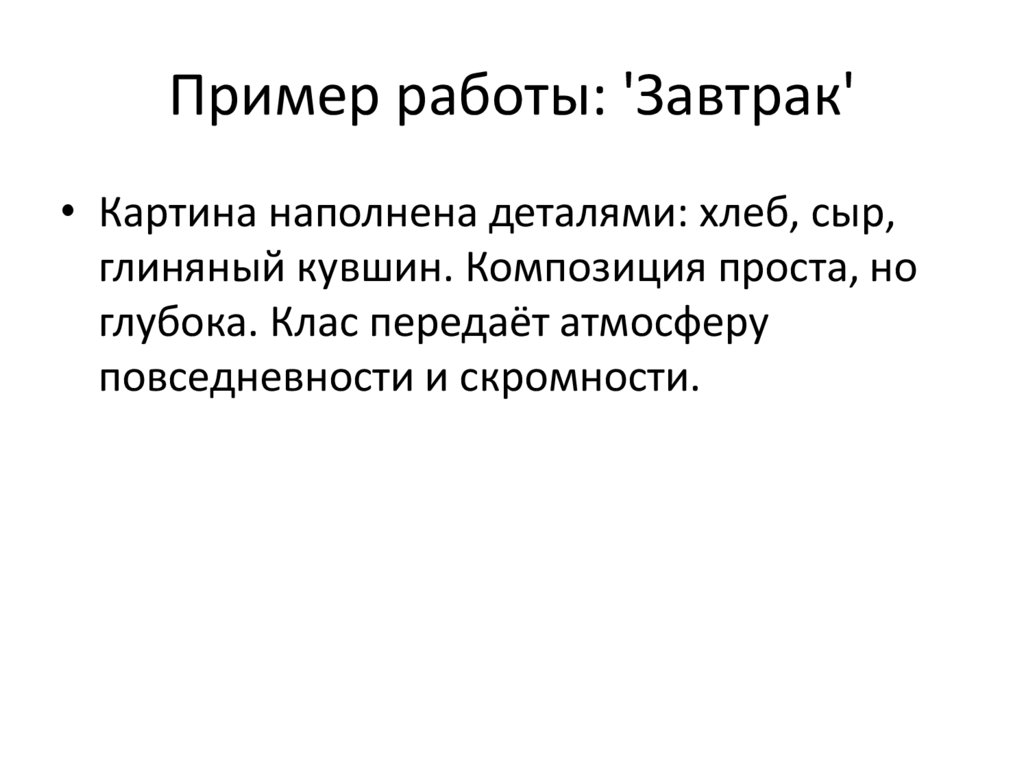 Пример работы: 'Завтрак'• Картина наполнена деталями: хлеб, сыр,