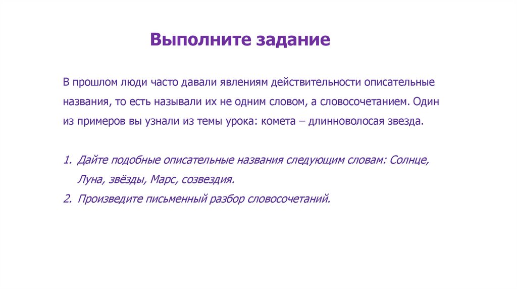 Выполните заданиеВ прошлом люди часто давали явлениям действительности описательные