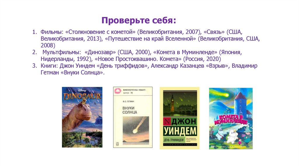 Проверьте себя:1. Фильмы: «Столкновение с кометой» (Великобритания, 2007), «Связь» (США,