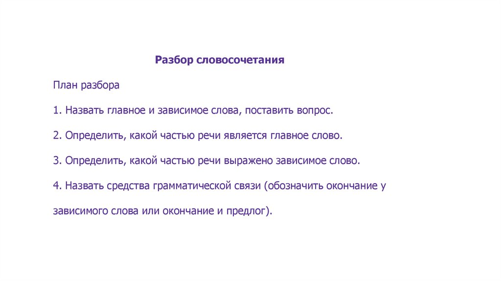 1. Назвать главное и зависимое слова, поставить вопрос.