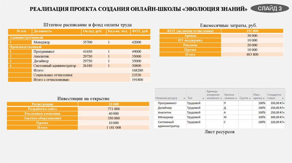 РЕАЛИЗАЦИЯ ПРОЕКТА СОЗДАНИЯ ОНЛАЙН-ШКОЛЫ «ЭВОЛЮЦИЯ ЗНАНИЙ»Штатное расписание и фонд оплаты труда