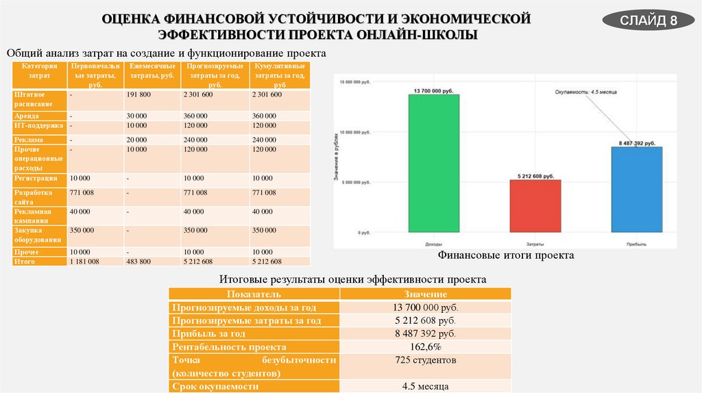 провести оценку финансовой устойчивости и экономической эффективности проекта онлайн-школы