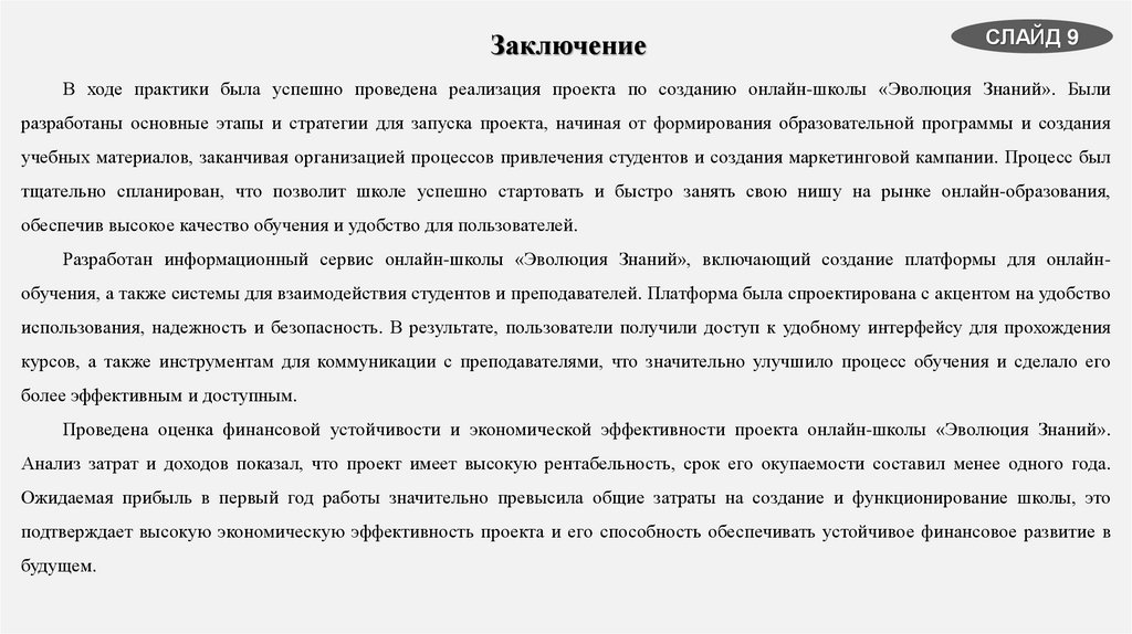 В ходе практики была успешно проведена реализация проекта по созданию онлайн-школы «Эволюция Знаний». Были