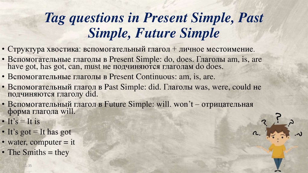 • Структура хвостика: вспомогательный глагол + личное местоимение.• Вспомогательные глаголы в Present Simple: do, does. Глаголы am, is, are