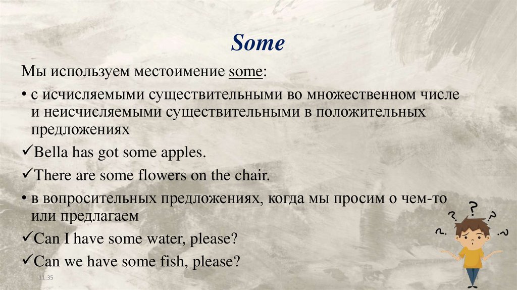 Мы используем местоимение some:• с исчисляемыми существительными во множественном числе