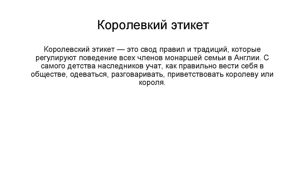 Королевкий этикетКоролевский этикет — это свод правил и традиций, которые
