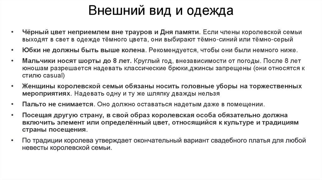 Внешний вид и одеждаЧёрный цвет неприемлем вне трауров и Дня памяти. Если члены королевской семьи