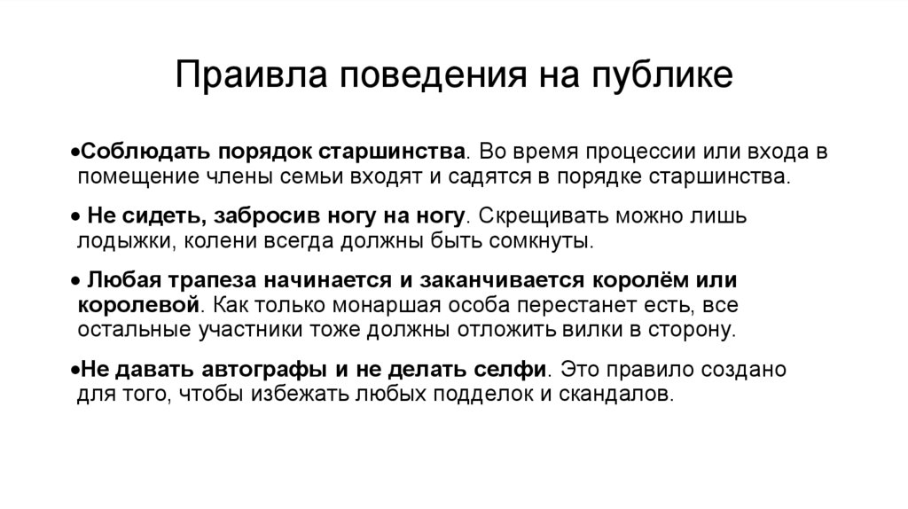 Праивла поведения на публикеСоблюдать порядок старшинства. Во время процессии или входа в