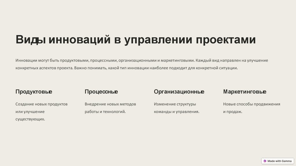 конкретных аспектов проекта. Важно понимать, какой тип инновации наиболее подходит для конкретной ситуации.
