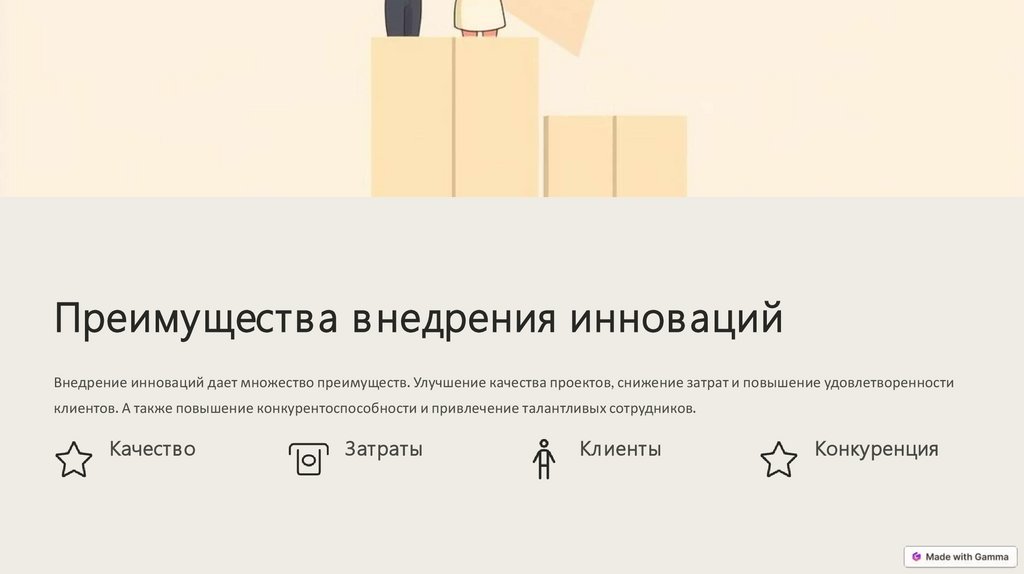 Преимущества в недрения инновацийВнедрение инноваций дает множество преимуществ. Улучшение качества проектов, снижение затрат и повышение удовлетворенности
