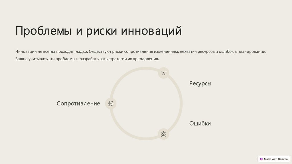 Проблемы и риски инновацийИнновации не всегда проходят гладко. Существуют риски сопротивления изменениям, нехватки ресурсов и ошибок в планировании.