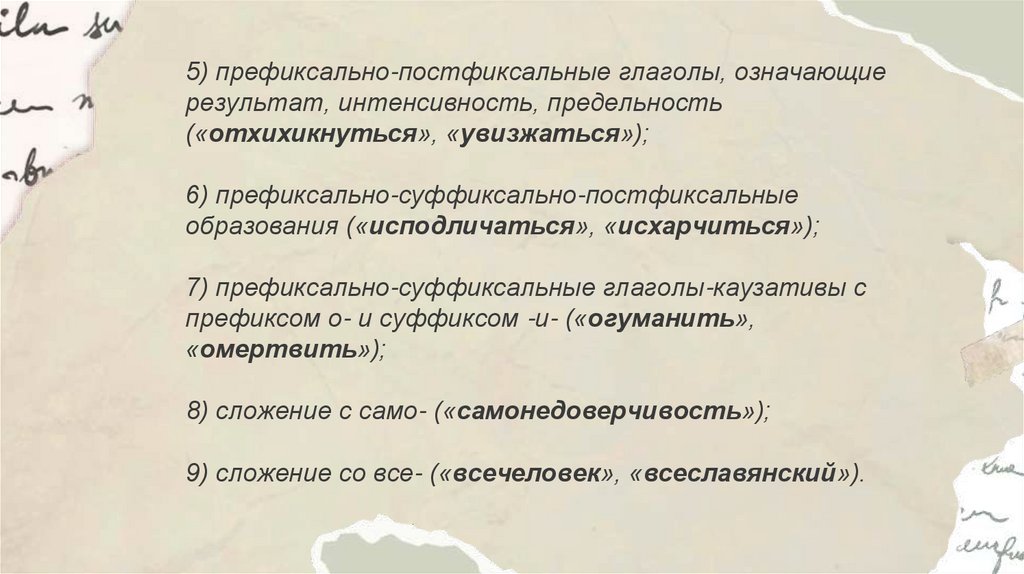 5) префиксально-постфиксальные глаголы, означающиерезультат, интенсивность, предельность