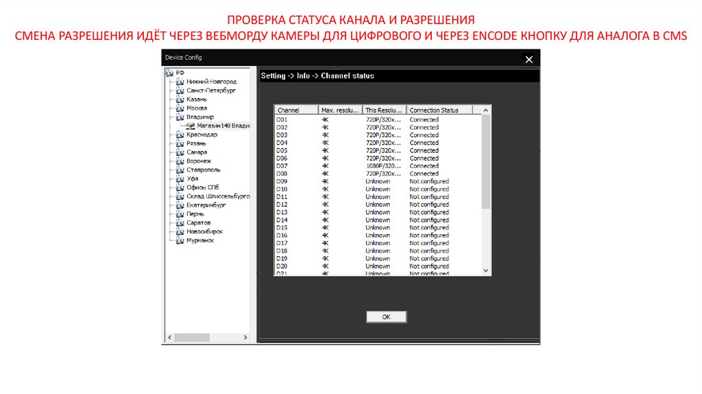 ПРОВЕРКА СТАТУСА КАНАЛА И РАЗРЕШЕНИЯСМЕНА РАЗРЕШЕНИЯ ИДЁТ ЧЕРЕЗ ВЕБМОРДУ КАМЕРЫ ДЛЯ ЦИФРОВОГО И ЧЕРЕЗ ENCODE КНОПКУ ДЛЯ АНАЛОГА В CMS