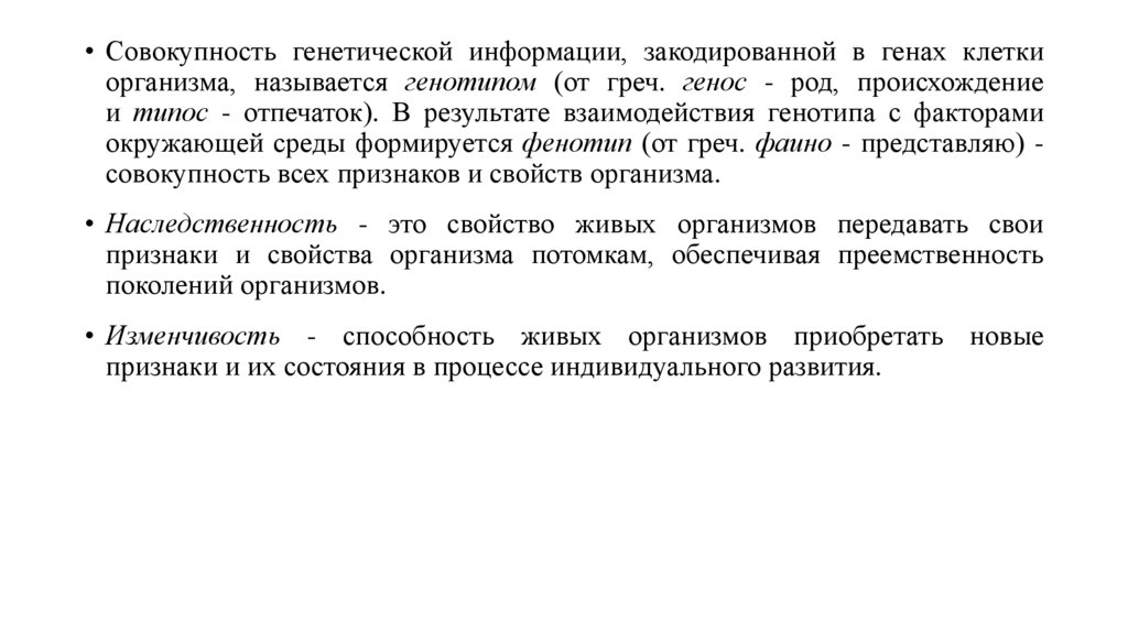 • Совокупность генетической информации, закодированной в генах клеткиорганизма, называется генотипом (от греч. генос - род, происхождение