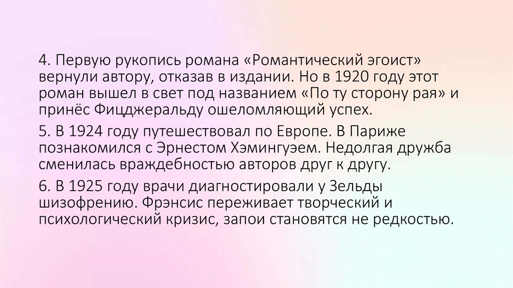 4. Первую рукопись романа «Романтический эгоист»вернули автору, отказав в издании. Но в 1920 году этот