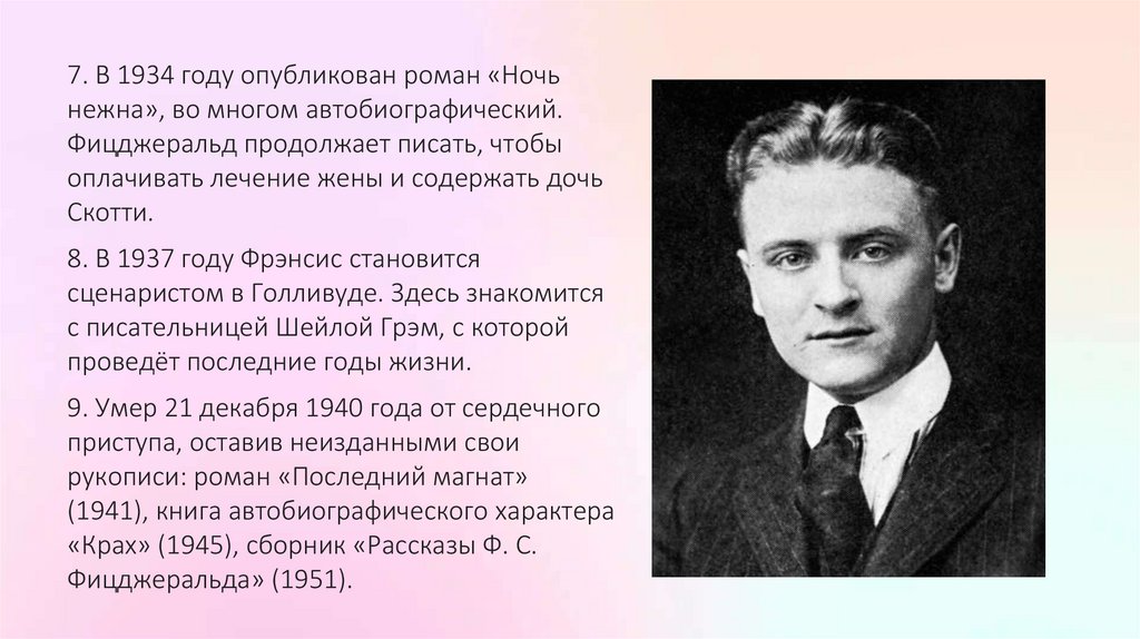 7. В 1934 году опубликован роман «Ночьнежна», во многом автобиографический.