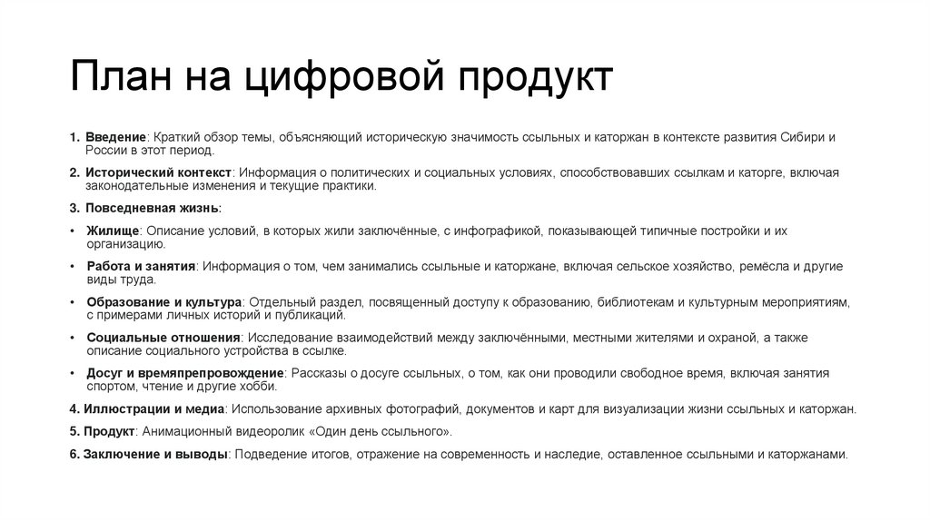 План на цифровой продукт1. Введение: Краткий обзор темы, объясняющий историческую значимость ссыльных и каторжан в контексте развития Сибири и