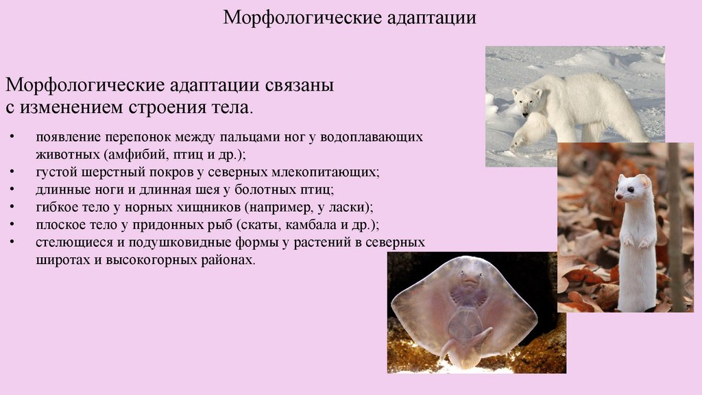 плоское тело у придонных рыб (скаты, камбала и др.);