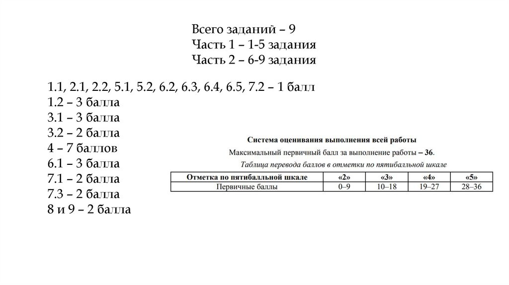 1.1, 2.1, 2.2, 5.1, 5.2, 6.2, 6.3, 6.4, 6.5, 7.2 – 1 балл