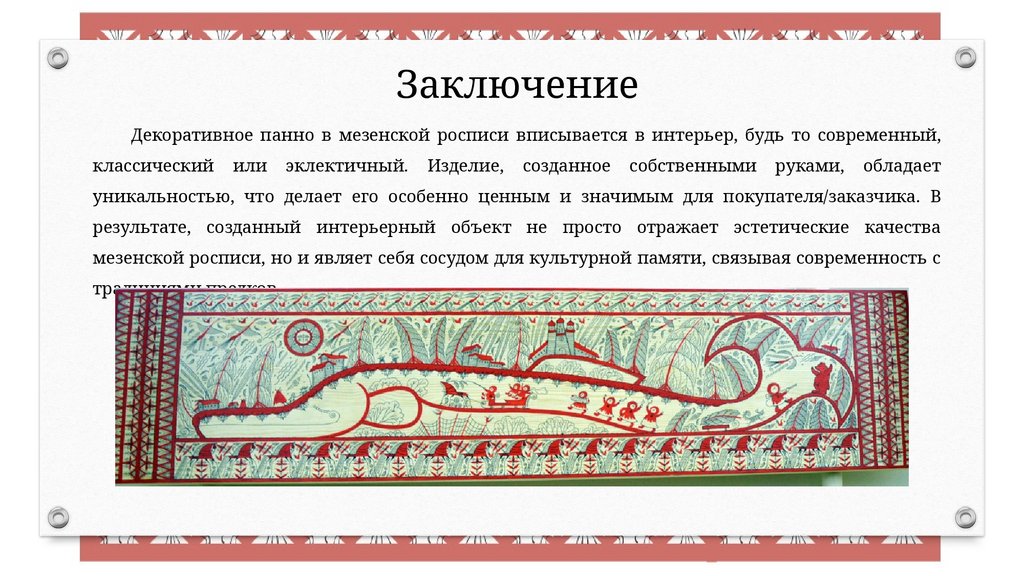 ЗаключениеДекоративное панно в мезенской росписи вписывается в интерьер, будь то современный,