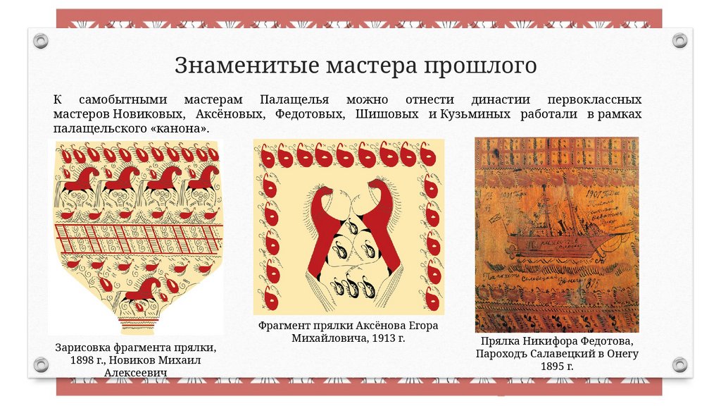 Знаменитые мастера прошлогоК самобытными мастерам Палащелья можно отнести династии первоклассных