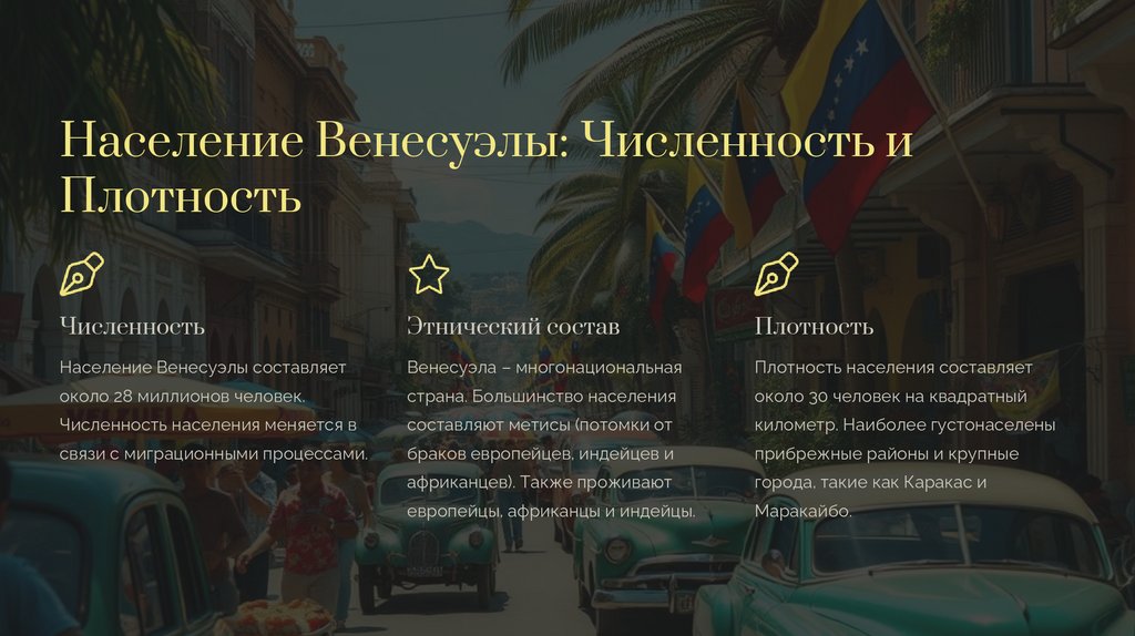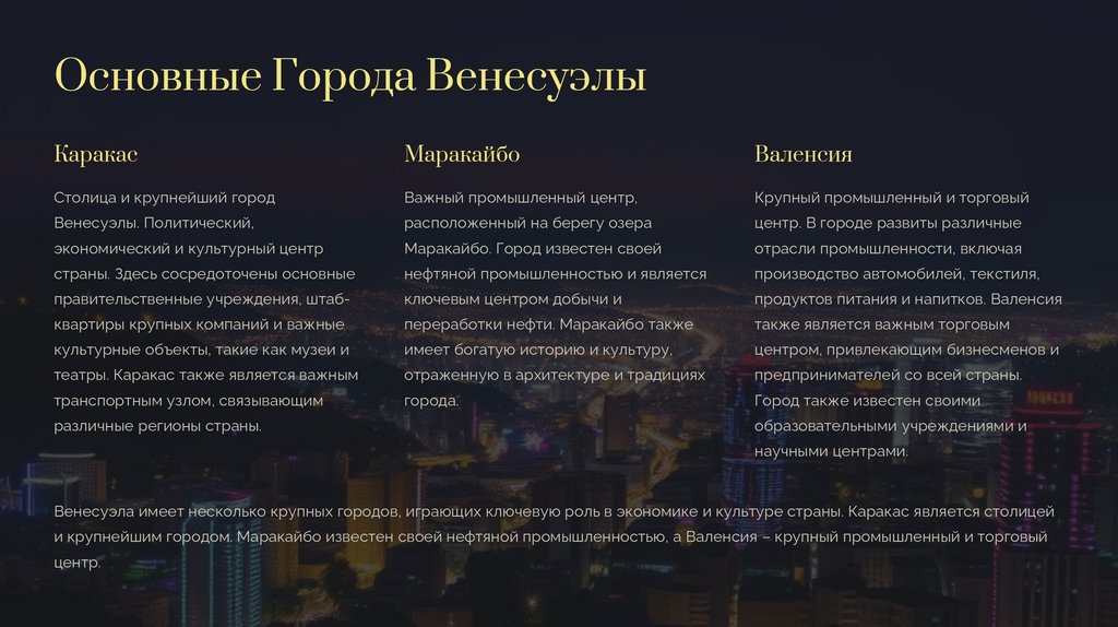 Венесуэла имеет несколько крупных городов, играющих ключевую роль в экономике и культуре страны. Каракас является столицей