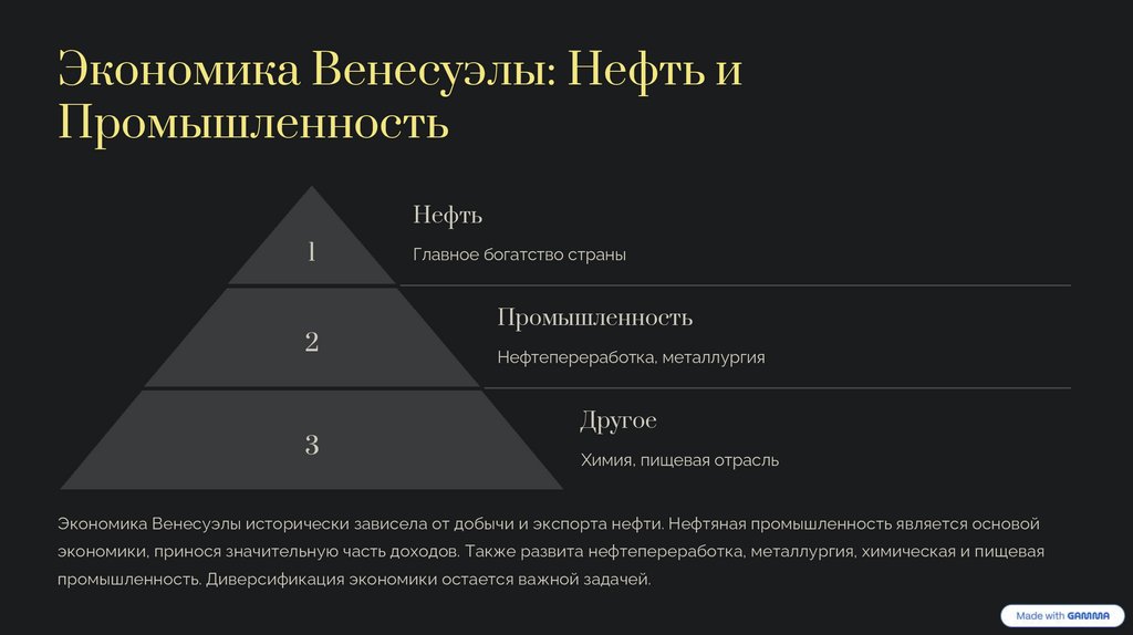 Экономика Венесуэлы исторически зависела от добычи и экспорта нефти. Нефтяная промышленность является основой