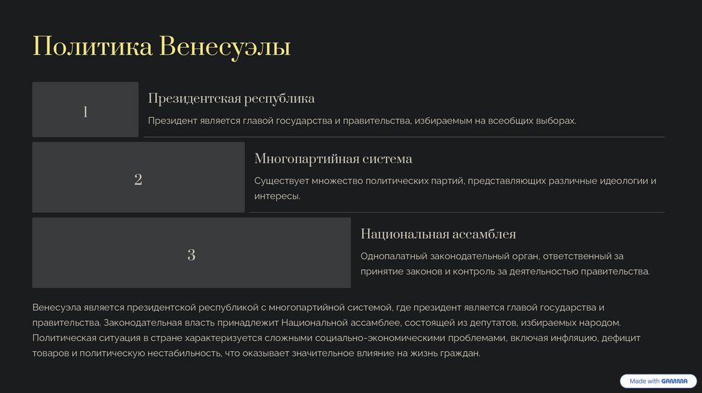 Венесуэла является президентской республикой с многопартийной системой, где президент является главой государства и