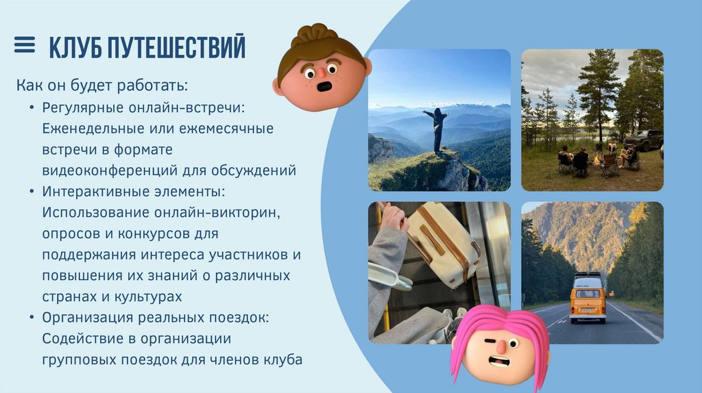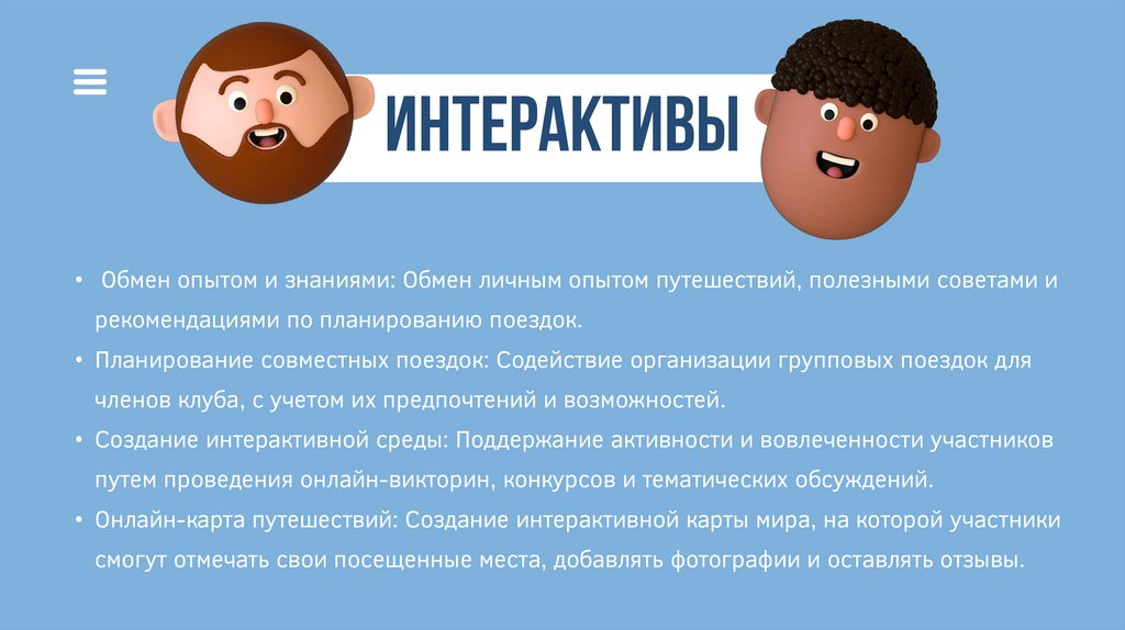 Интерактивы• Обмен опытом и знаниями: Обмен личным опытом путешествий, полезными советами и