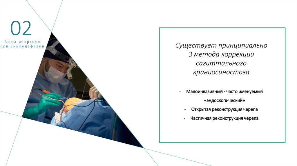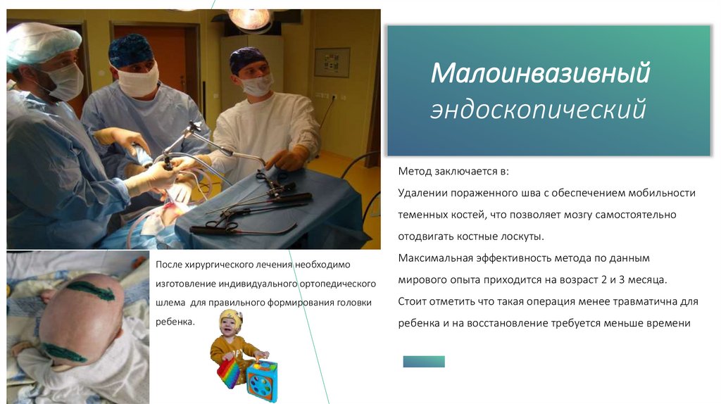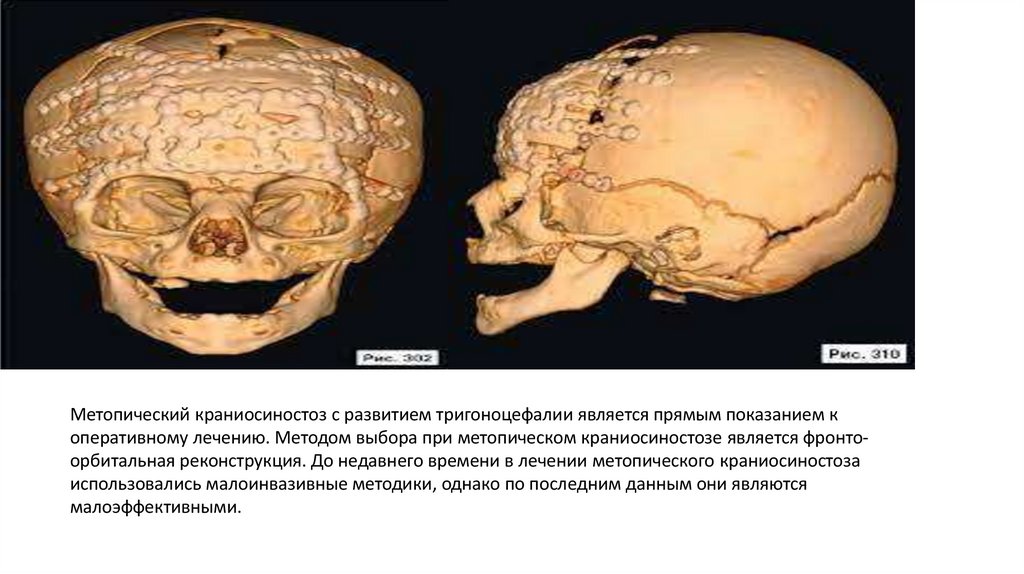 Метопический краниосиностоз с развитием тригоноцефалии является прямым показанием коперативному лечению. Методом выбора при метопическом краниосиностозе является фронтоорбитальная реконструкция. До недавнего времени в лечении метопического краниосиностоза