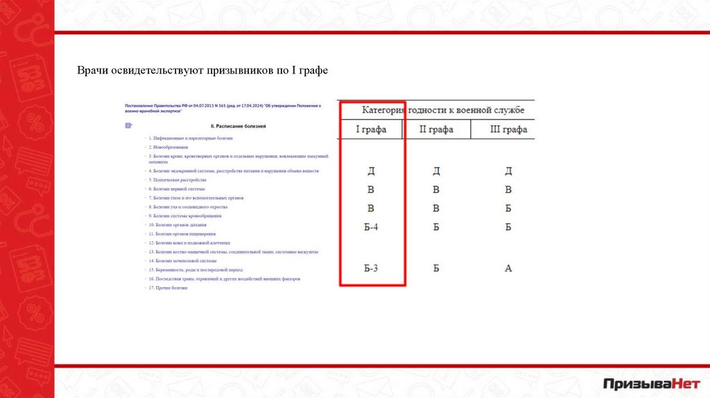 согласно Расписанию болезней, где около 2000 заболеваний. Для получения категории “В” ,