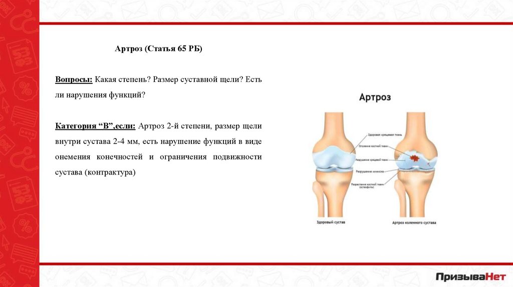 Категория “В”,если: Артроз 2-й степени, размер щели