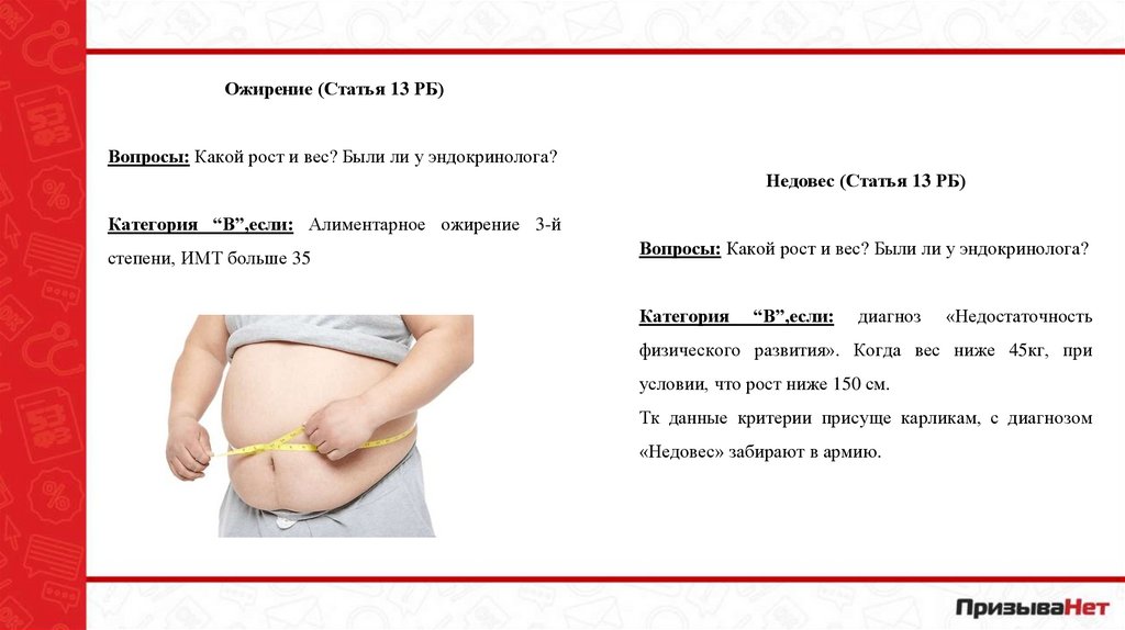 Ожирение (Статья 13 РБ)Вопросы: Какой рост и вес? Были ли у эндокринолога?