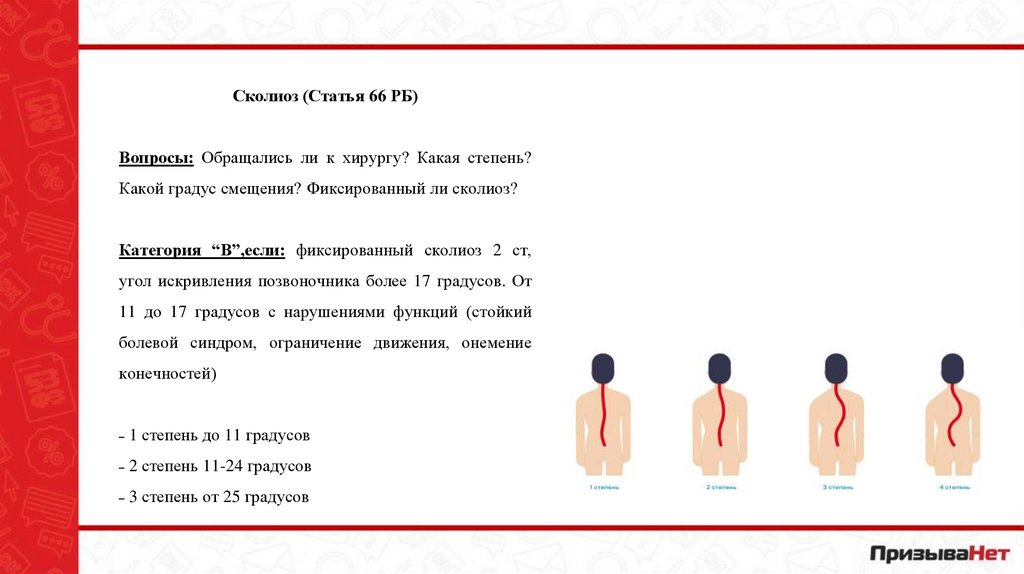 Сколиоз (Статья 66 РБ)Вопросы: Обращались ли к хирургу? Какая степень?