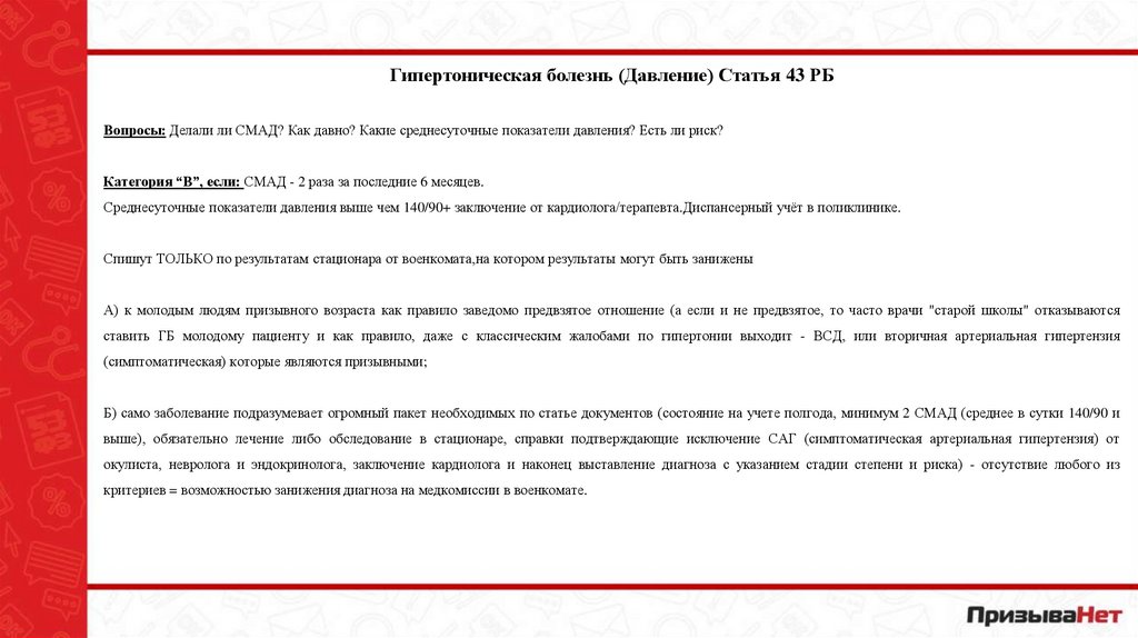 Гипертоническая болезнь (Давление) Статья 43 РБВопросы: Делали ли СМАД? Как давно? Какие среднесуточные показатели давления? Есть ли риск?