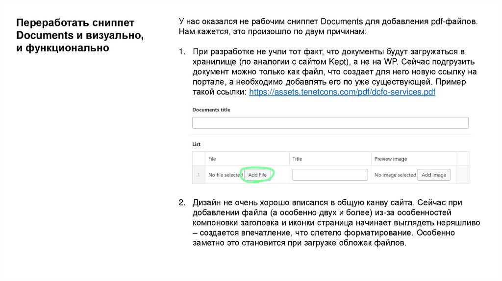 У нас оказался не рабочим сниппет Documents для добавления pdf-файлов.