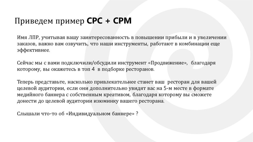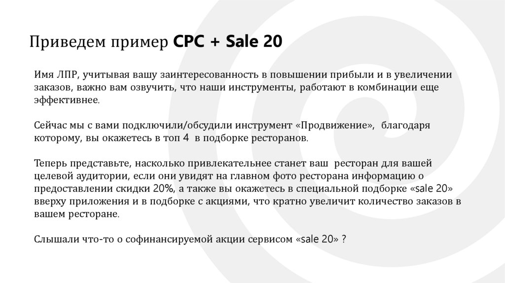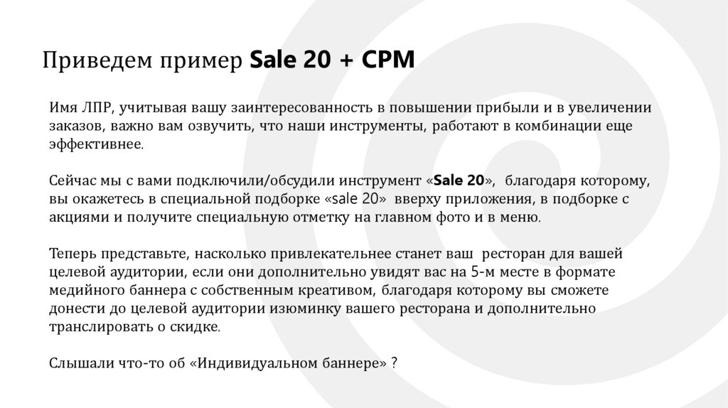 Приведем пример Sale 20 + CPMИмя ЛПР, учитывая вашу заинтересованность в повышении прибыли и в увеличении