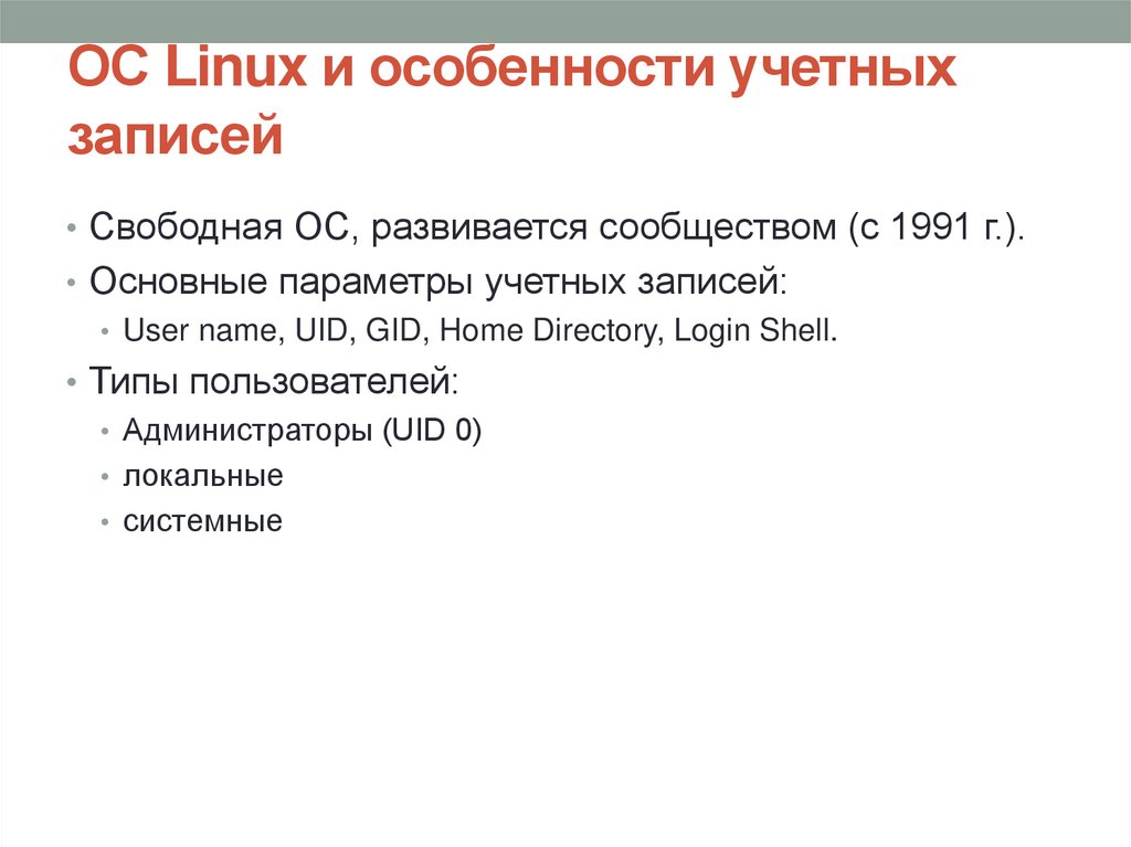 • Свободная ОС, развивается сообществом (с 1991 г.).• Основные параметры учетных записей:
