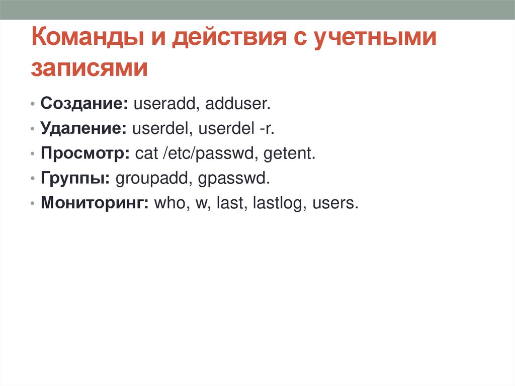 • Создание: useradd, adduser.• Удаление: userdel, userdel -r.