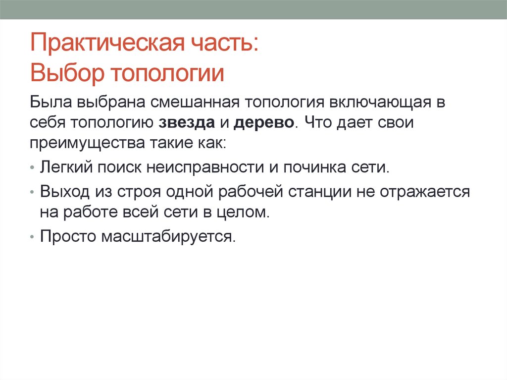 Была выбрана смешанная топология включающая всебя топологию звезда и дерево. Что дает свои