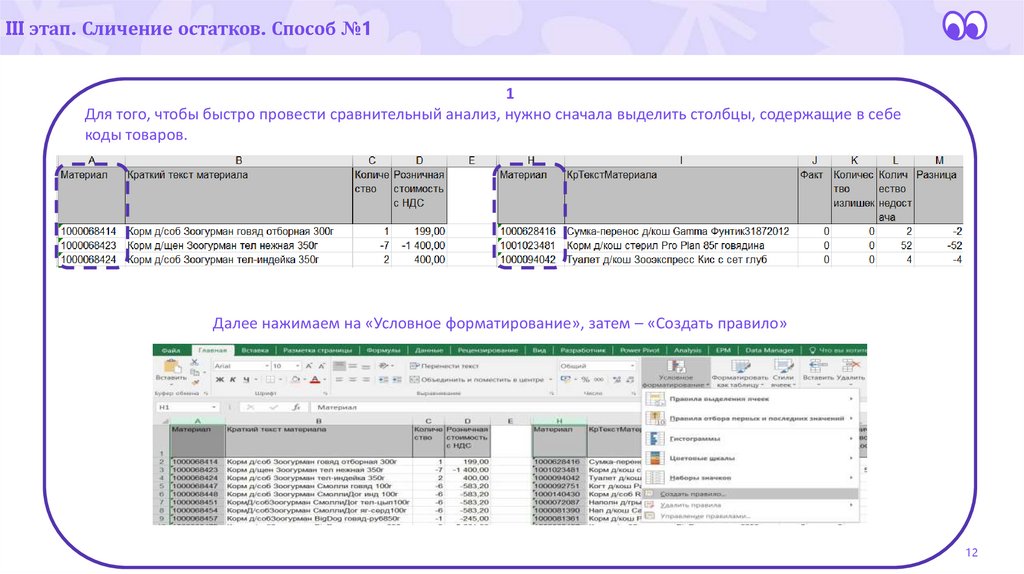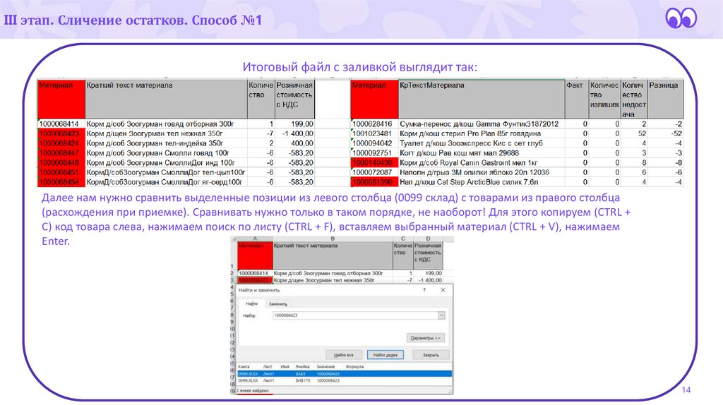 III этап. Сличение остатков. Способ №1Итоговый файл с заливкой выглядит так: