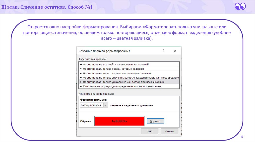 III этап. Сличение остатков. Способ №1Откроется окно настройки форматирования. Выбираем «Форматировать только уникальные или